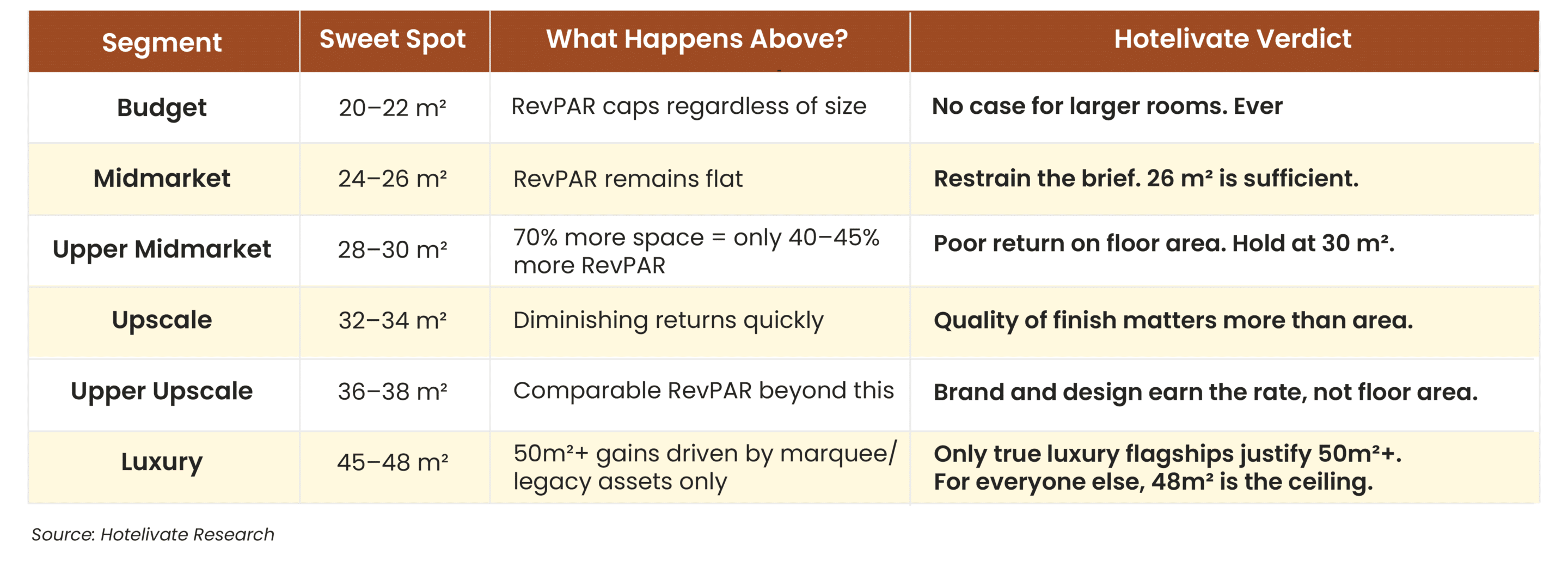 The most actionable output of this analysis is the identification of room size ‘sweet spots’ by positioning — the point at which RevPAR is optimised relative to development cost. Beyond these thresholds, additional floor area adds cost without adding performance.